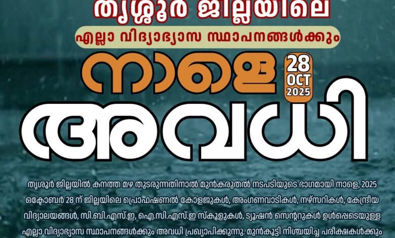 തൃശ്ശൂര് ജില്ലയിലെ വിദ്യാഭ്യാസ സ്ഥാപനങ്ങള്ക്ക് നാളെ ( ഒക്ടോബർ 28) അവധി